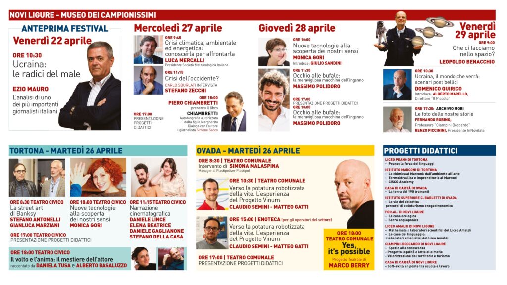 Il Festival prenderà il via martedì 26 aprile, ogni giornata sarà dedicata a temi e ospiti d’eccezione in contemporanea a Ovada e Tortona. A Ovada al Teatro Comunale sede degli eventi avremo una giornata riservata alla tecnologia, con la presentazione di un robot di ultima generazione atto alla potatura delle vigne. Nel pomeriggio alle 17, le scuole ovadesi presenteranno i loro progetti didattici; a seguire, Marco Berry metterà in scena il suo monologo Yes, it’s possible. A Tortona, Teatro Civico, sempre il 26 aprile mattino, Stefano Antonelli e Gianluca Marziani si occuperanno della street art di Banksy. A seguire Monica Gori ricercatrice dell’Istituto Italiano di Tecnologia, presenterà protesi robotiche per la scoperta dei sensi, quindi Daniele Lince ed Elena Beatrice proietteranno il loro cortometraggio Verdiana, con Angela Finocchiaro. Nel pomeriggio dalle 17 presentazione dei progetti didattici delle scuole superiori, a seguire alle 18 Daniela Tusa e Alberto Basaluzzo racconteranno il mestiere dell’attore.